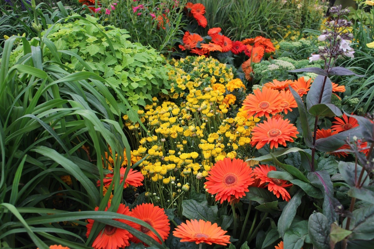熱情的非洲菊“摩天輪”與可愛明亮的黃晶菊“閃亮”,在花境的構(gòu)成中是能夠抓住人眼球的好品種。
