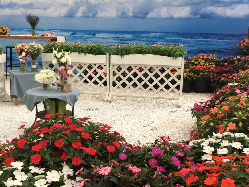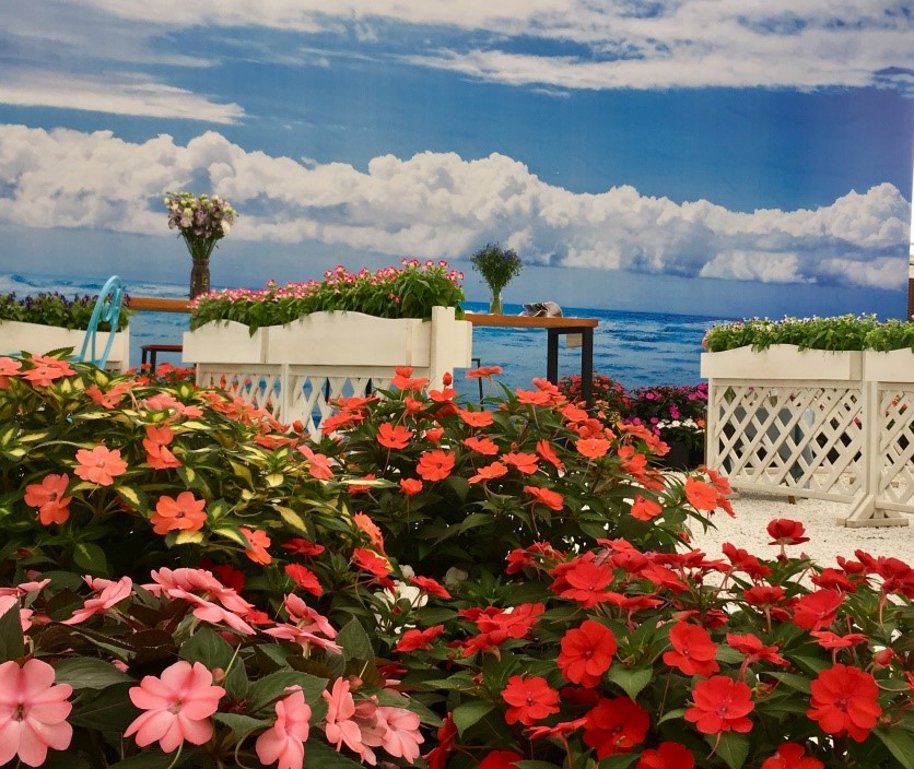 在坂田公司的展位上,我們主打“桑蓓斯®”的盆栽組合應(yīng)用,采用藍(lán)天白云,細(xì)石白沙為背景,為參觀者營(yíng)造出在海邊漫步,被鮮花簇?fù)淼睦寺諊?。在室外,也大量種植了桑蓓斯,采用已有的多個(gè)花色進(jìn)行組合,達(dá)到室內(nèi)外相互呼應(yīng)的效果。