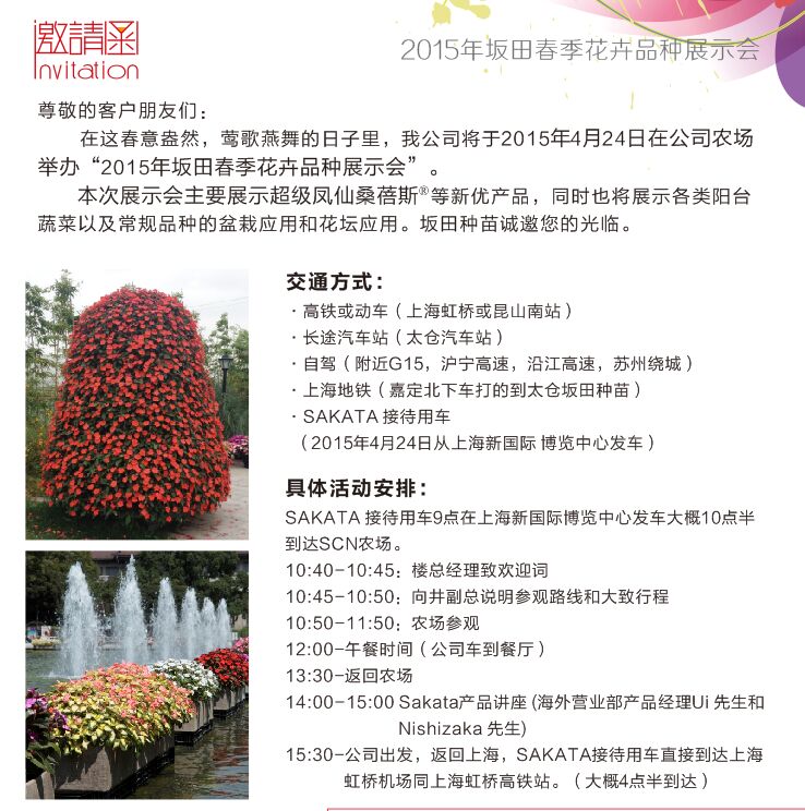尊敬的客戶朋友們: 在這春意盎然,鶯歌燕舞的日子里,我公司將于2015年4月24日在公司農(nóng)場舉辦“2015年坂田春季花卉品種展示會”。本次展示會主要展示超級鳳仙桑蓓斯®等新優(yōu)產(chǎn)品,同時也將展示各類陽臺蔬菜以及常規(guī)品種的盆栽應用和花壇應用。坂田種苗誠邀您的光臨。