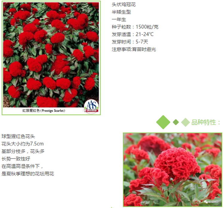 聊完了群株炫彩的雞冠花,讓我們再看看歷經(jīng)二十年而不衰的經(jīng)典品種-雞冠花紅頂系列!是由坂田公司精心培育的優(yōu)良品種。并于1997年榮獲AAS大獎。