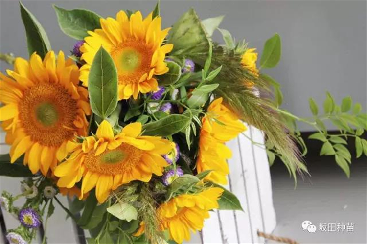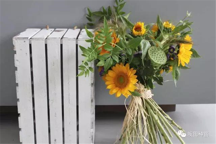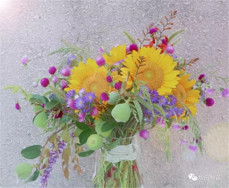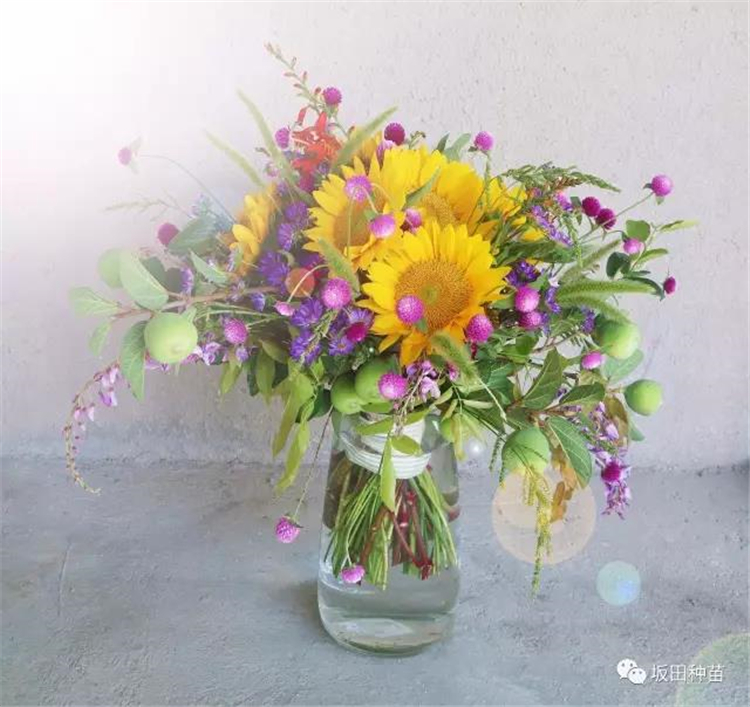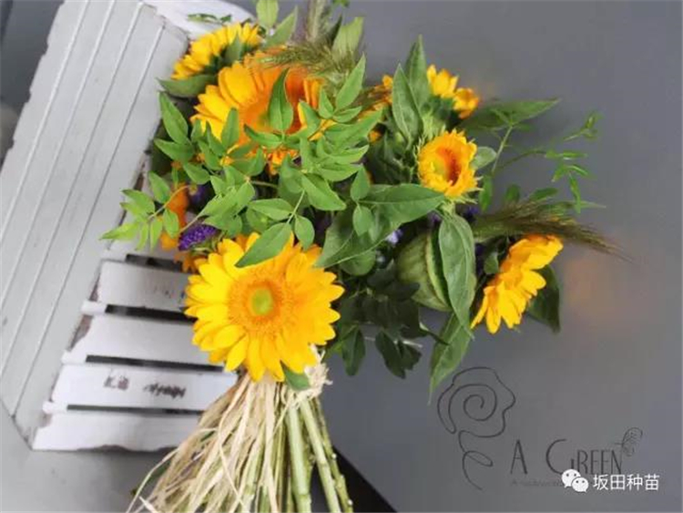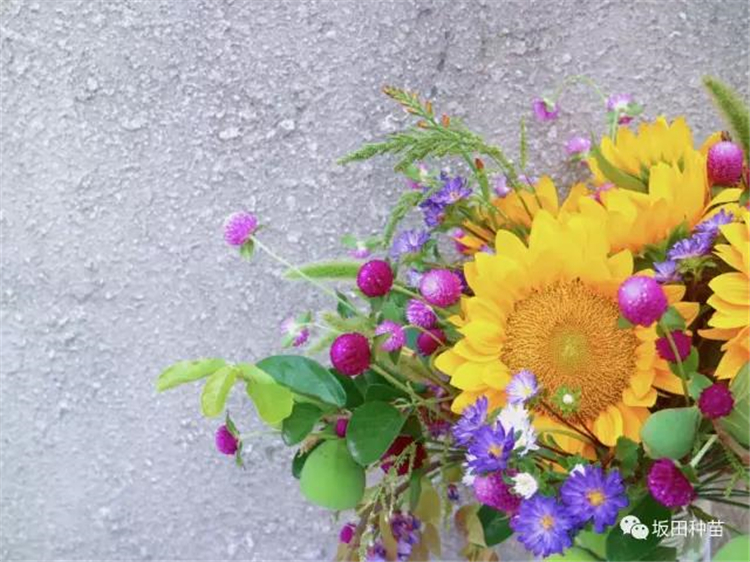 在千日紅、翠菊等精巧小花的簇?fù)硐?,更能顯示出向日葵作為主體的清新燦爛,又少了一分向日葵自身的粗壯感。