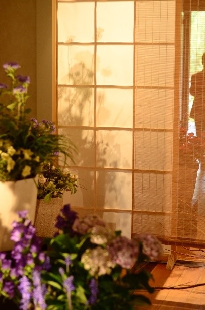 設(shè)計(jì)場(chǎng)景是一個(gè)日本的茶室及庭院,用于迎客。茶室中布置有屏風(fēng)、竹簾,案臺(tái)上擺放有當(dāng)季植物的盆景,春日清晨,薄霧未散,陽(yáng)光初照,透過門窗灑向植物,將其投影于屏風(fēng)之上,投影觀賞點(diǎn)是以植物的自然姿態(tài)為主,有風(fēng)吹過的芒草,輕輕搖動(dòng)的海棠花果實(shí),營(yíng)造出組合自然環(huán)境中清風(fēng)搖曳,飄動(dòng)靈氣的感覺,運(yùn)用屏風(fēng)和竹簾又?jǐn)U大了組合的觀賞面,以及營(yíng)造出飄渺迷蒙的意境,虛實(shí)結(jié)合,增添樂趣。
