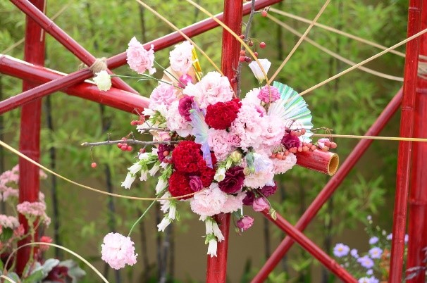 秋季展示著重應(yīng)用雞冠花“世紀(jì)”、彩葉草“絢麗彩虹”、“航路”、百日草“豐盛”、“重瓣豐盛”渲染秋日氛圍,切花雞冠花“首領(lǐng)”、向日葵“文森特”、洋桔?!安ɡ恕?、“蕾娜”等系列做重點(diǎn)強(qiáng)調(diào)。結(jié)合架構(gòu)強(qiáng)烈的朱紅色和金色竹篾飄帶,令觀眾印象深刻。