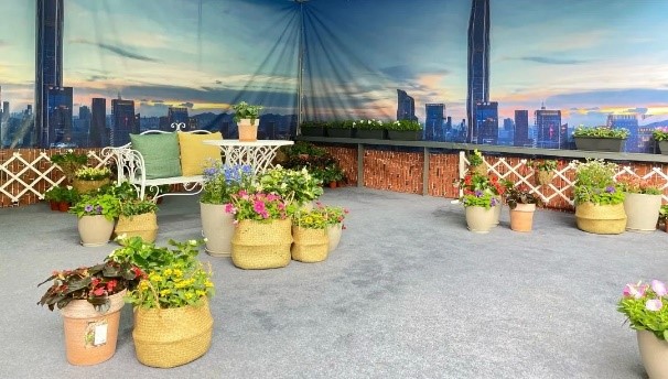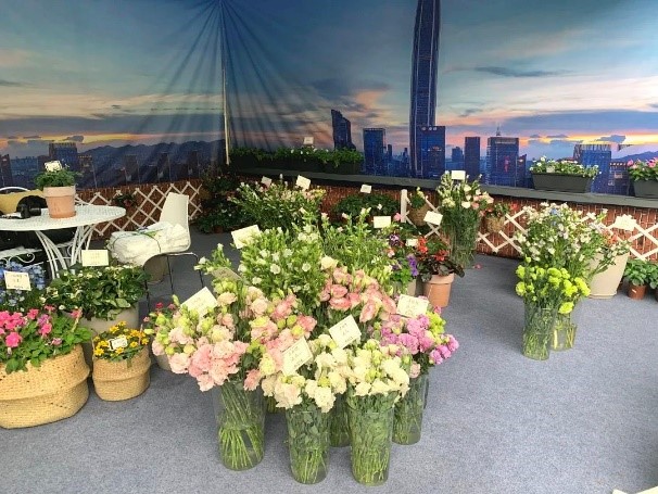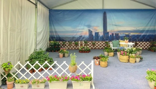 坂田花卉展位,以都市與自然為主題打造了一個(gè)幽靜的天空花園,都市是借用了深圳的城市圖,作為花園的主體背景;