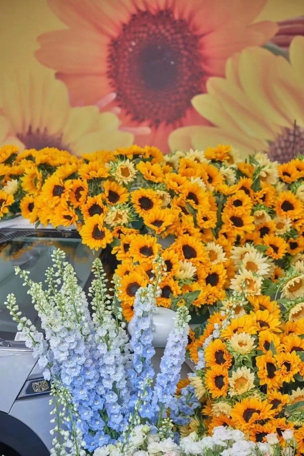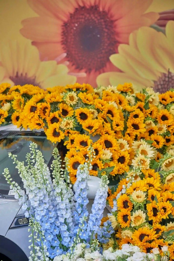 人氣超旺,效果超贊的杭州丹諾園藝展位,運(yùn)用了坂田花卉的切花品種,向日葵文森特®2系列、大花飛燕草燭光系列、