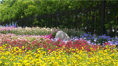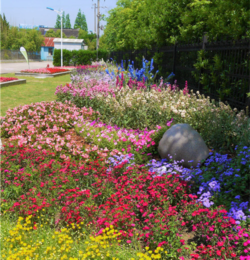 進(jìn)入坂田種苗(蘇州)有限公司的大門,便可見右側(cè)大花壇運用花境設(shè)計方式種植了許多花卉品種,主要有紫羅蘭“四重奏”系列、藿香薊“藍(lán)色視野”、黃金菊“閃亮”、冰島虞美人“仙境”、銀蓮花“和諧”、大花飛燕草“燭光”系列、石竹“鉆石”系列、風(fēng)鈴草“超級冠軍”系列和“冠軍”系列。