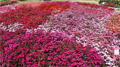石竹“鉆石”是早生品種,無論盆栽還是地栽,主側(cè)枝的花期都一致,且系列各花色長勢、花期均勻,用于組合花壇有著不俗的表現(xiàn)。